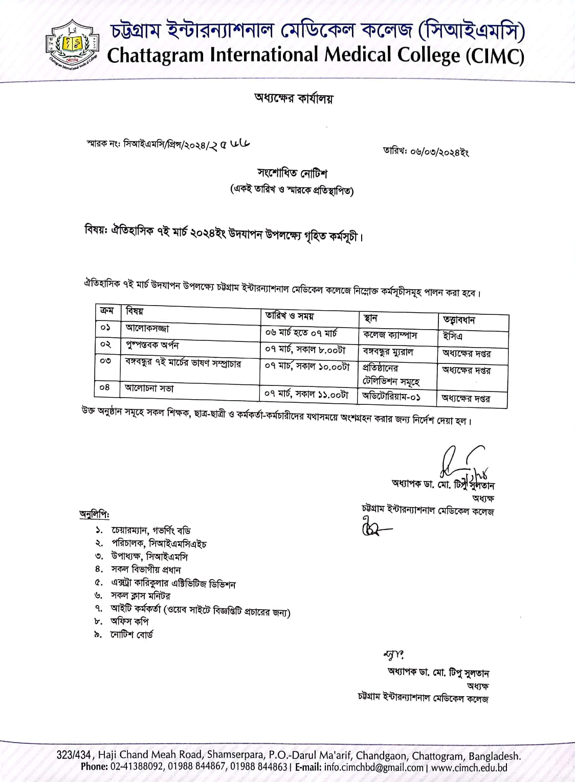 ৭ই মার্চের গৃহিত কর্মসূচি